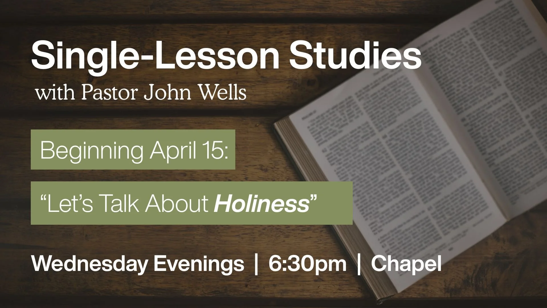 Join Pastor John Wells as we walk through his recurring teaching series. Each six-week study is designed to offer lessons that can be attended weekly, or just once. No study materials needed; just show up!