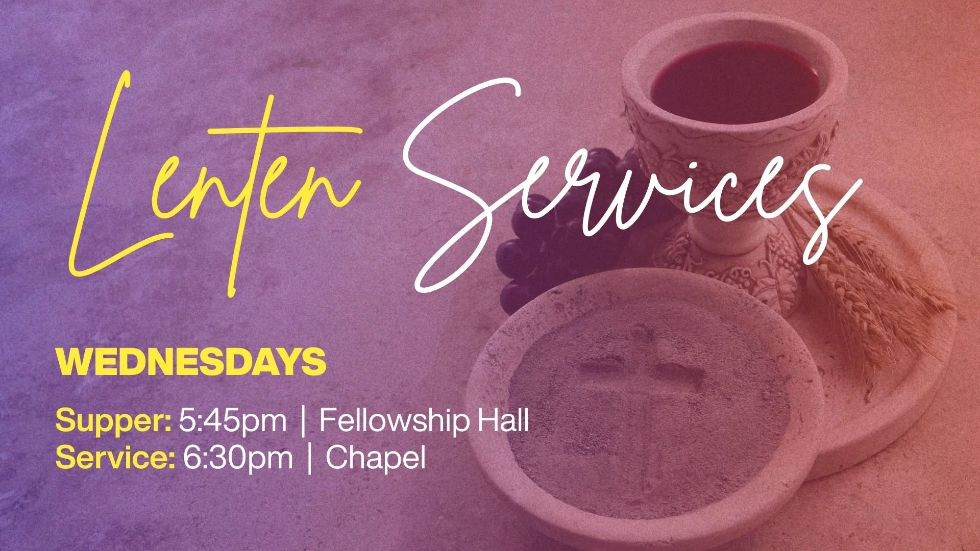 Each Wednesdays during Lent we will come together for a meal at 5:45 p.m. in the Fellowship Hall followed by worship at 6:30. The meal is free of charge and open to the public. Donations are welcome.